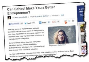 I stumbled over Antonio Neves’ post Can School Make You a Better Entrepreneur? on Entrepreneur.com. Antonio does a good job giving a balanced view of that very interesting question, and he asks bonified smart person Chris Guillebeau too, which is always a good idea. Chris gets the best quote in the piece: ‘You might as well learn … Continue reading Can School Make You a Better Entrepreneur?